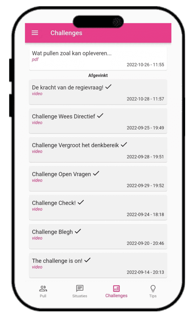 2. Het is een continue reminder. Je ontvangt 1x per week een reminder: tips, tekstjes, filmpjes of challenges voor die dag. Die reminders komen op je telefoon binnen als push-notificatie in de Circle app. Of in je mail als je dat liever wil. Ze zorgen ervoor dat je steeds weer pull-scherpte hebt. Het helpt je om het pullen in je dagelijkse praktijk te brengen.
